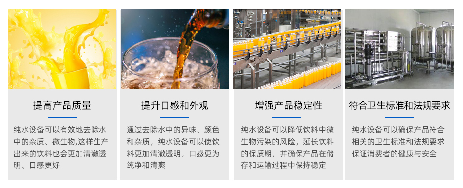 飲料中水的含量非常高,如果使用未經(jīng)處理的自來水或地下水,其中可能存在各種雜質(zhì)、重金屬、細菌和病毒等,這些物質(zhì)會對產(chǎn)品的色澤、口感和品質(zhì)產(chǎn)生影響,甚至會對人體健康造成危害。因此,使用經(jīng)過嚴格處理的純水,可以避免以上問題,保證飲料的品質(zhì)。